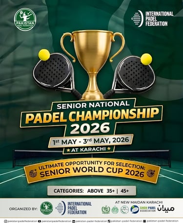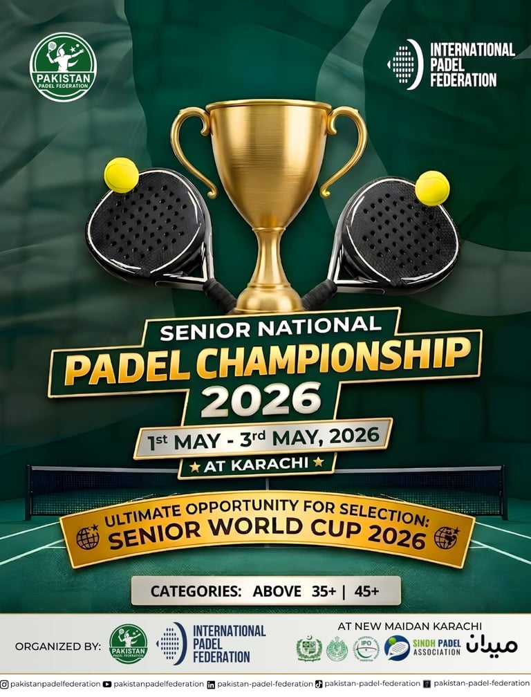 Pakistan Padel Federation (PPF) proudly announces the Senior National Padel Championship 2026, scheduled to be held in Karachi from 1st to 3rd May, 2026. The championship is organized by PPF under the esteemed umbrella of the International Padel Federation (FIP), reaffirming Pakistan’s growing presence in the international padel community.