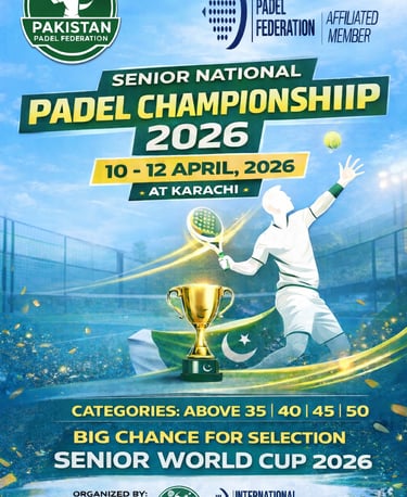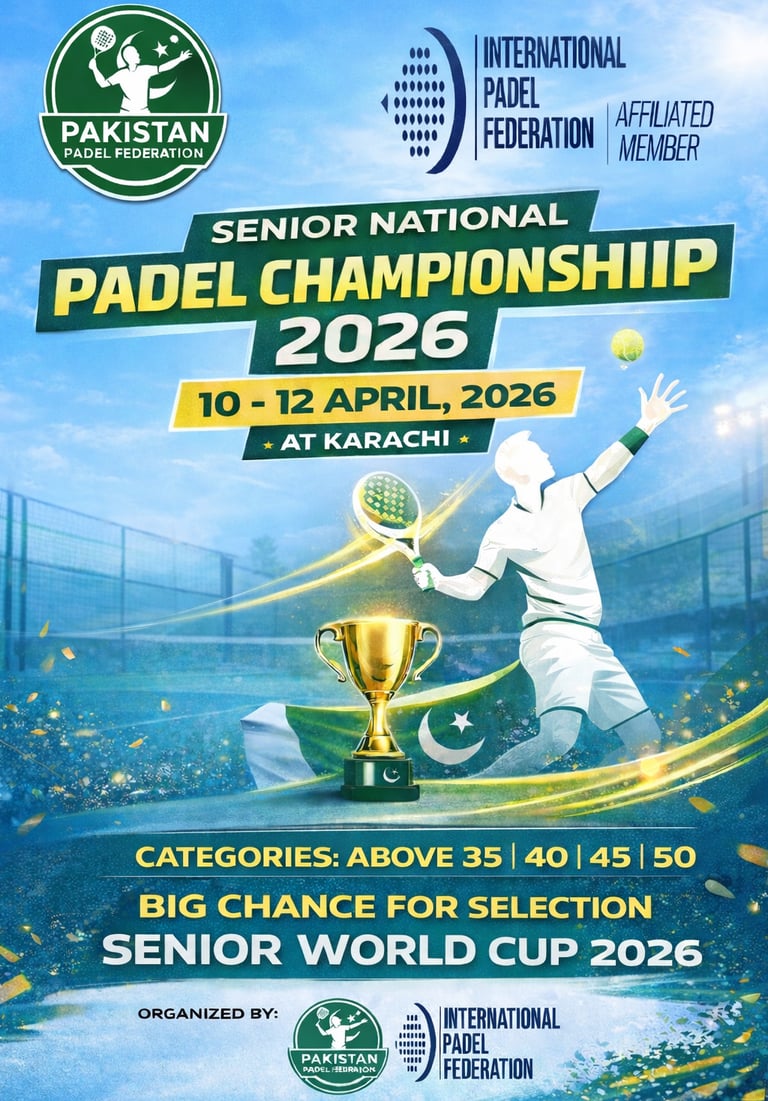 Pakistan Padel Federation (PPF) proudly announces the Senior National Padel Championship 2026, scheduled to be held in Karachi from 10th to 12th April 2026. The championship is organized by PPF under the esteemed umbrella of the International Padel Federation (FIP), reaffirming Pakistan’s growing presence in the international padel community.