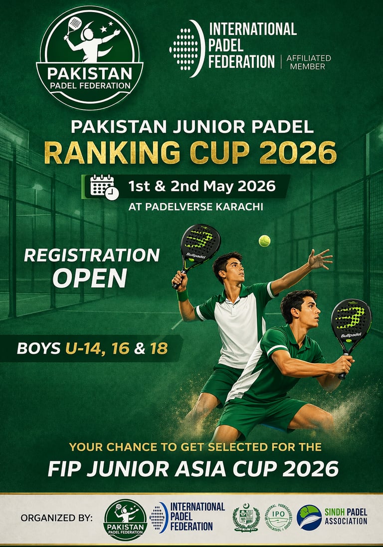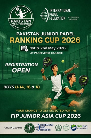 Pakistan Padel Federation (PPF) proudly announces the Pakistan Junior Padel Ranking Cup 2026, scheduled to be held in Karachi from 1st & 2nd May, 2026.